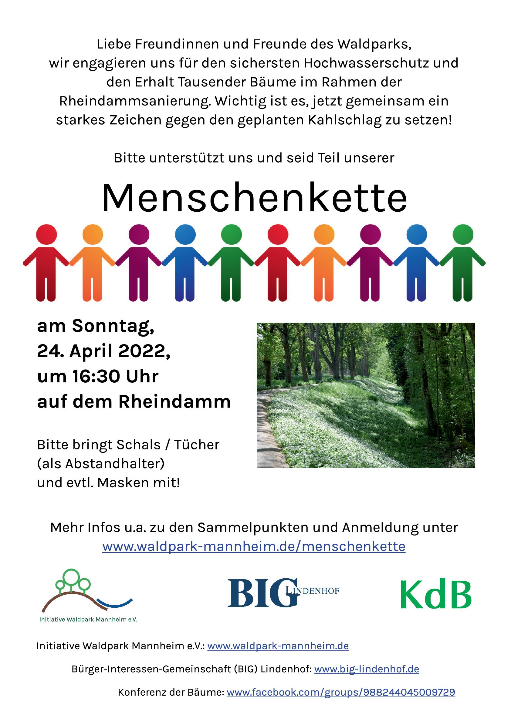 Wer von Euch/Ihnen kann helfen, für die Teilnahme an der Menschenkette am 24. April, 16:30 Uhr, auf dem Rheindamm zu werben? Der Flyer zu dieser Aktion liegt der aktuellen Ausgabe von „Lindenhof aktuell“ bei. Damit werden 15.500 Exemplare auf dem Lindenhof, Almenhof und im Niederfeld gestreut.