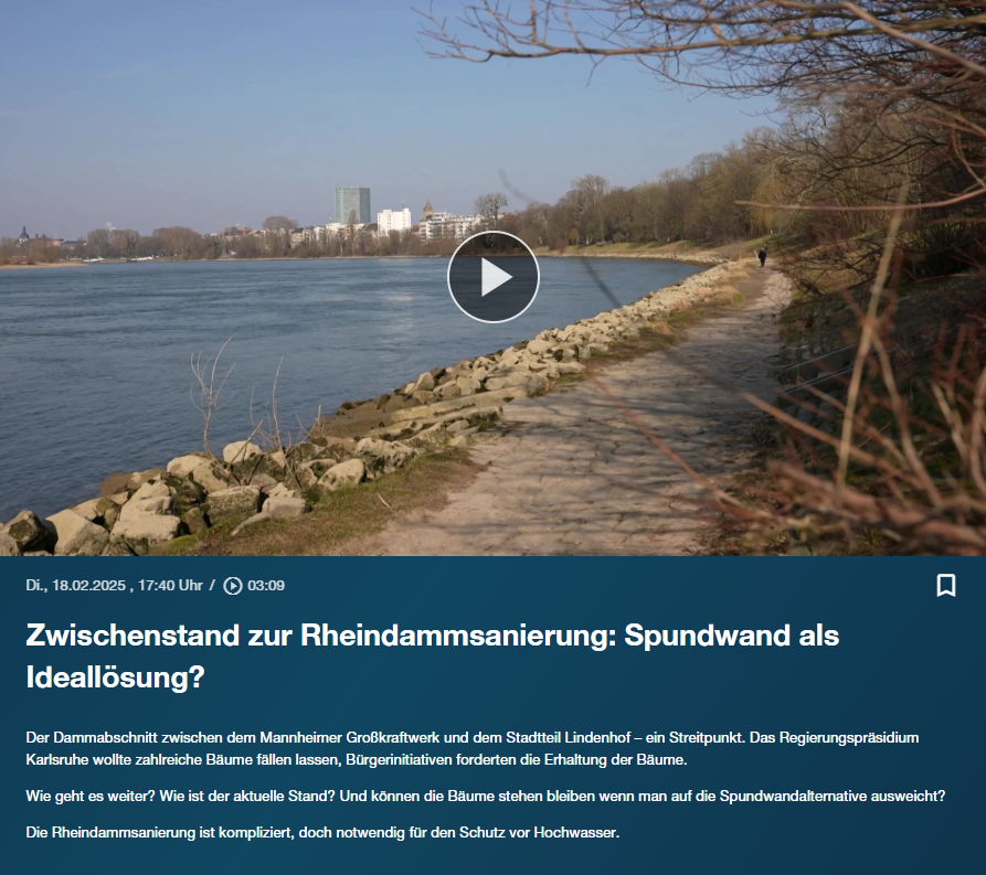 Einige – oder sehr viele – Bäume auf dem Damm müssen aber vielleicht schon allein wegen des Bauverfahrens entfernt werden. Laut der Pressemitteilung des RP vom 12.11.2025 ist der Eingriffskorridor durch die Breite der Spundwandramme und den Raum, den sie zum Schwenken braucht, bedingt.